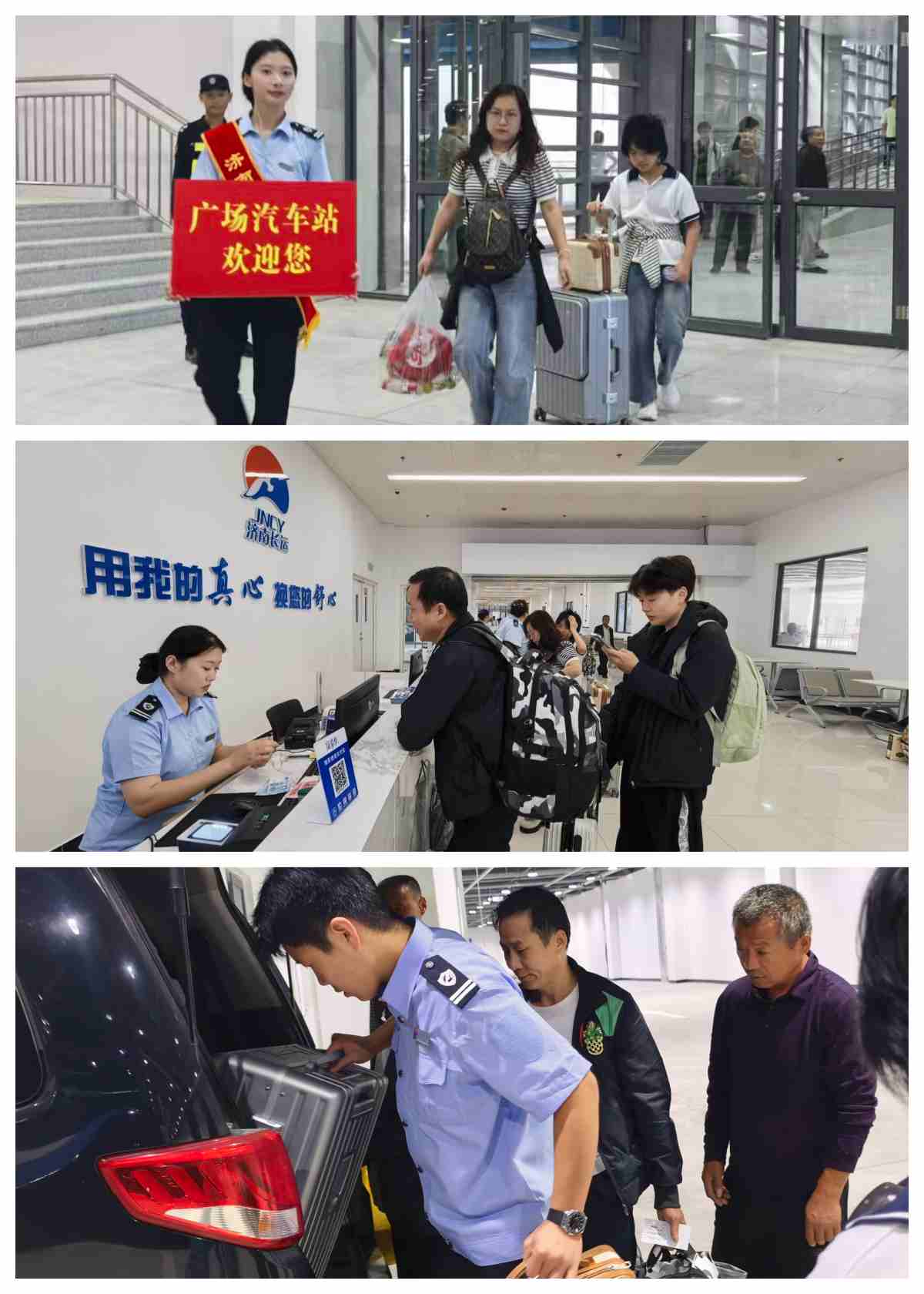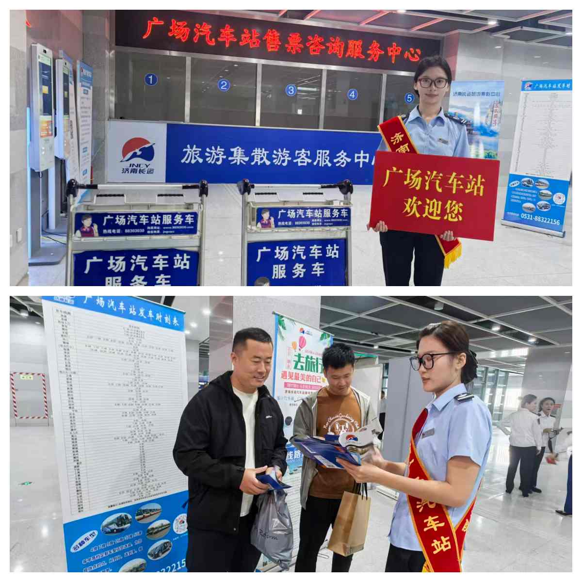 广场汽车站与北广场汽车站并行服务,进行协同调度。广场汽车站还在济南站北出站口、北广场地面旅客进站口、地铁口等位置设置专门服务导乘人员,保障进出北广场的旅客出行顺畅。