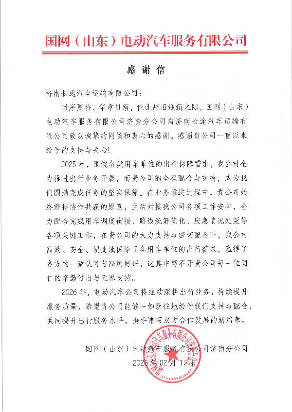 近日,国网(山东)电动汽车服务有限公司济南分公司向济南长运发来一封饱含诚挚谢意的感谢信,对济南长运在用车服务方面展现出的专业能力与优质服务给予了高度肯定与赞扬。
