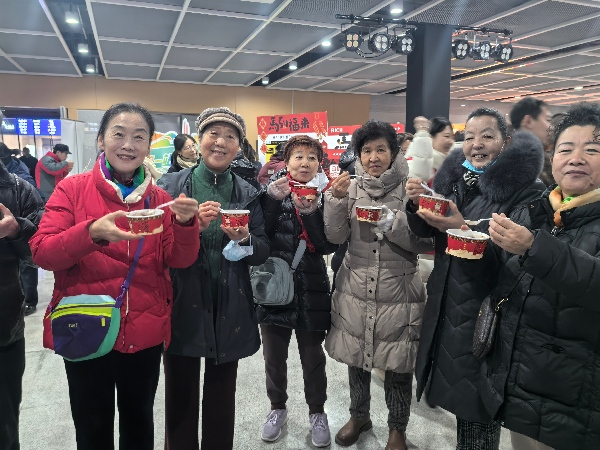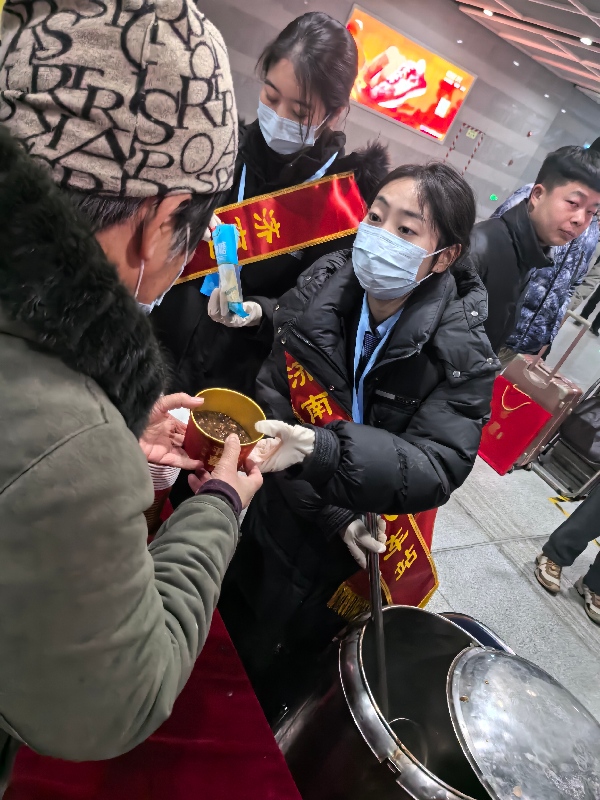 济南北广场汽车站站务员们将一碗碗热气腾腾、飘着红枣桂圆香气的腊八粥递到旅客手中,让归乡的脚步与泉城的冬日暖意撞个满怀。